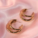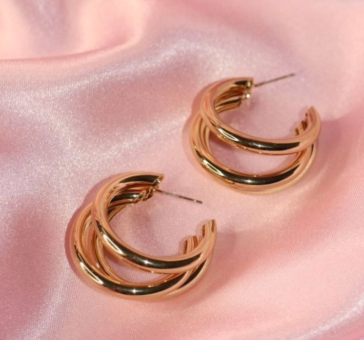 Aros tipo argolla triple en tono dorado, el equilibrio perfecto entre lo clásico y lo moderno. Su diseño aporta volumen sin perder delicadeza, ideal para elevar cualquier look, desde el más casual hasta el más chic.